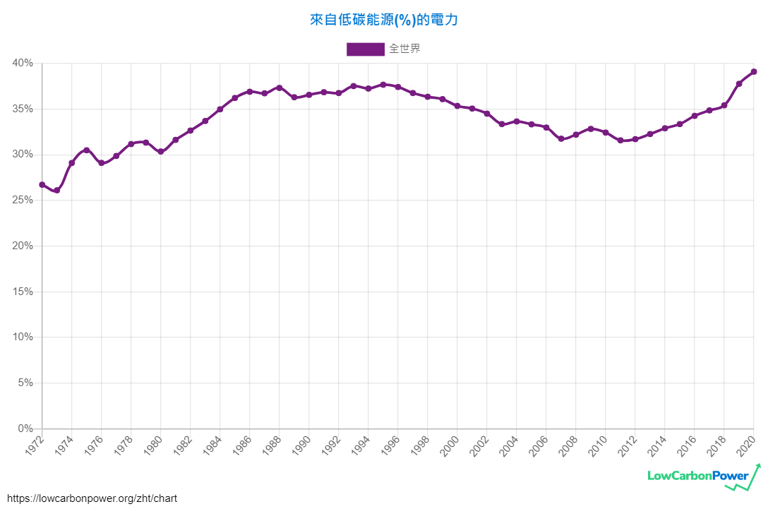 事實上,過去的50年裡低碳能源在全球發電量中所佔的比例並沒有多大變化: