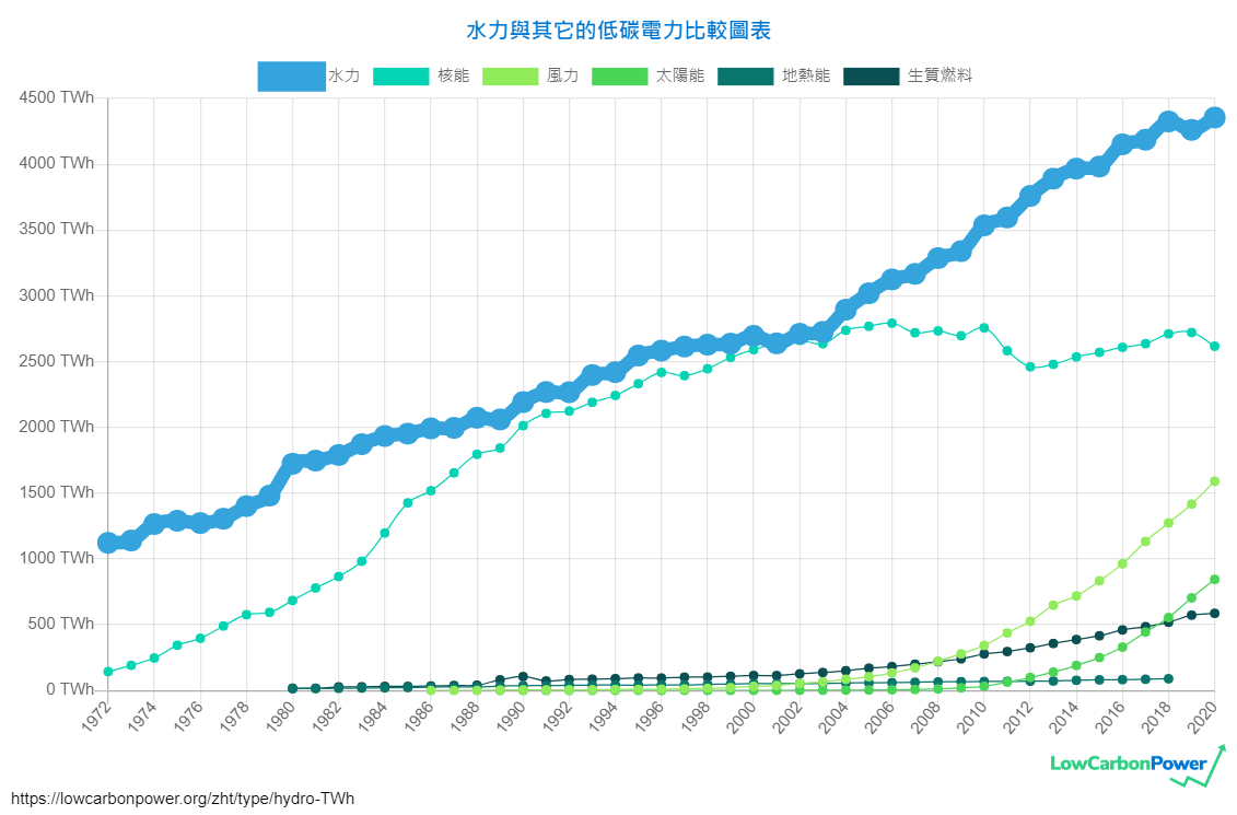 目前不論是風力、太陽能還是核能都不是最主要的低碳能源,這令嘗試在沒有技術偏見的情況下研究發電的我來說感到非常震撼。就如你透過標題猜到的答案一樣,實際上最主要的低碳電力來源其實是水力發電,即使太陽能和風力加起來仍略勝一籌。水力發電在過去50年裡都是最主要的低碳能源。雖然我們的數據並不含1972年以前,但我認為實際上它一直是最主要的低碳電力來源,因為核能發電在其存在的前20年貢獻不大,而太陽能與風力直到1980年代才開始對電網做出貢獻。